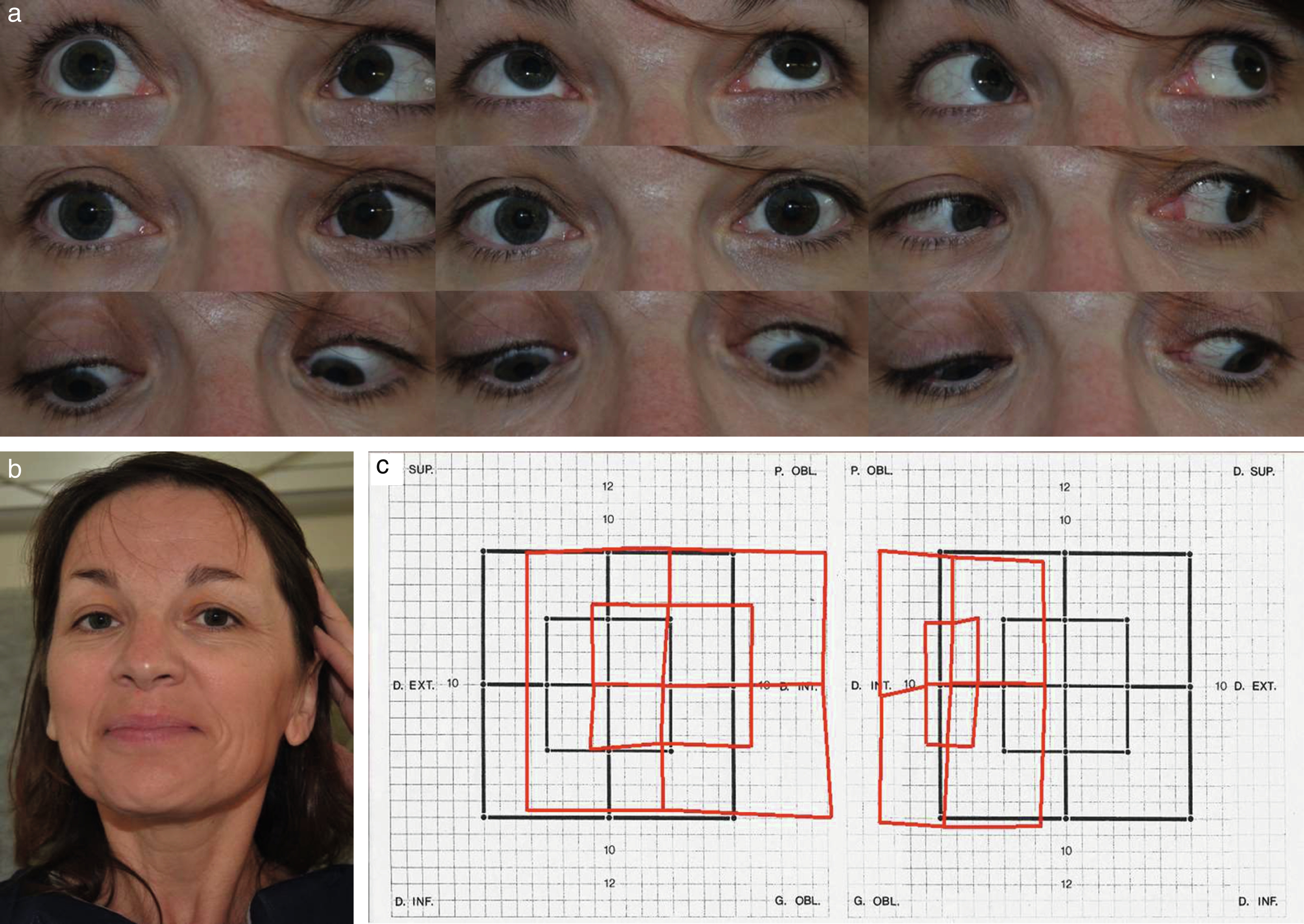 Tous les muscles sont atteints. Le patient ne rapporte pas de diplopie (« ptosis salvateur »). Il existe une divergence en position primaire accompagnée de façon inconstante d'une hypotropie. La divergence diminue dans l'abduction, augmente dans l'adduction. L'analyse de la motilité met en évidence un déficit d'élévation, d'abaissement et d'adduction qu'il faut quantifier.