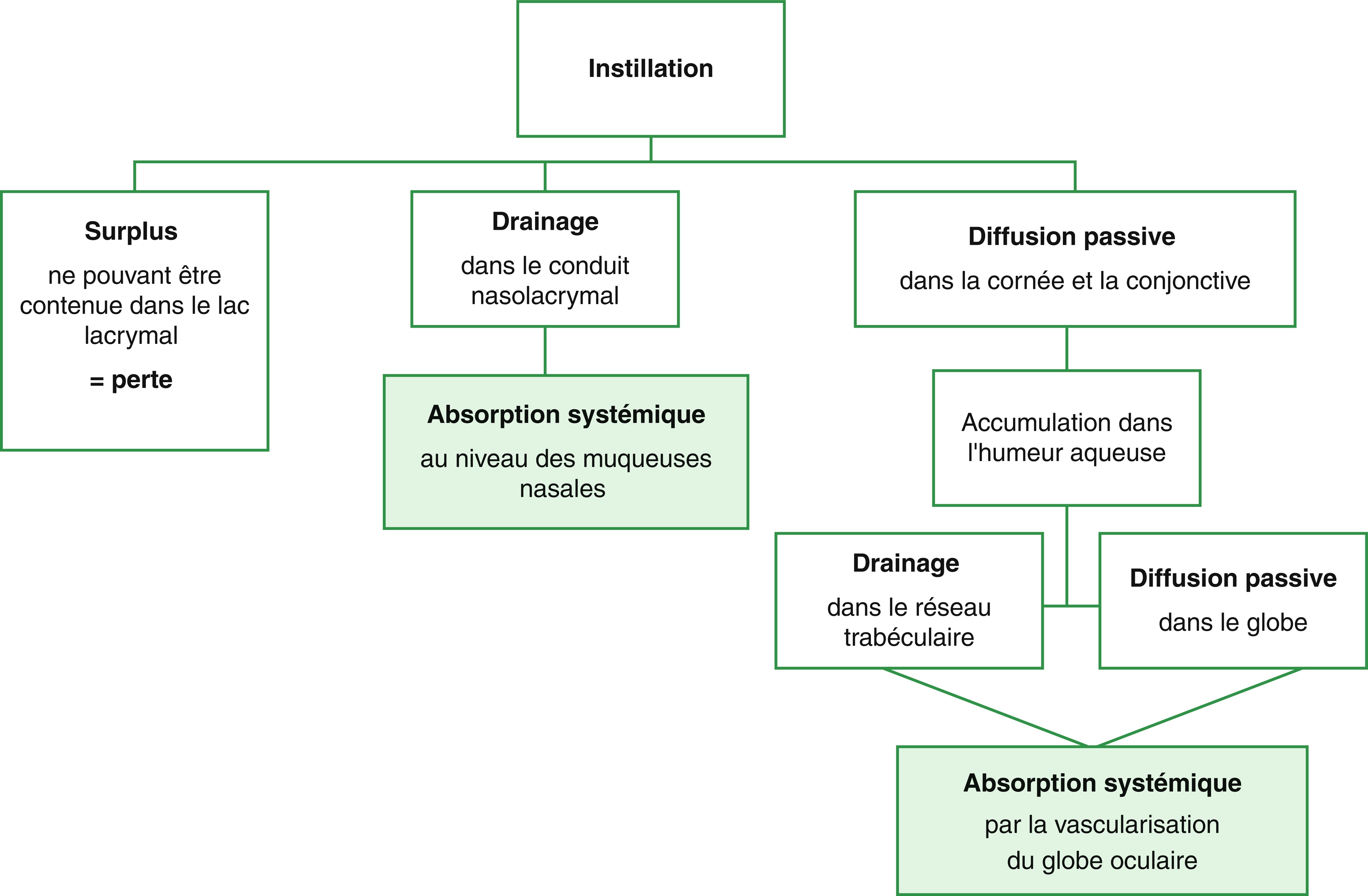 La diffusion par voie topique se fait de deux manières : une partie est drainée par les voies d'évacuation de l'appareil lacrymal pour être ensuite majoritairement absorbée au niveau de la muqueuse nasale et passer dans la circulation générale. L'autre partie diffuse passivement à travers la cornée, la sclère et la conjonctive, et sa force de diffusion dépend du gradient de concentration entre le film lacrymal précornéen et l'épithélium. Cette force de diffusion est directement proportionnelle à la concentration en anesthésique dans le film lacrymal (fig. 24-1