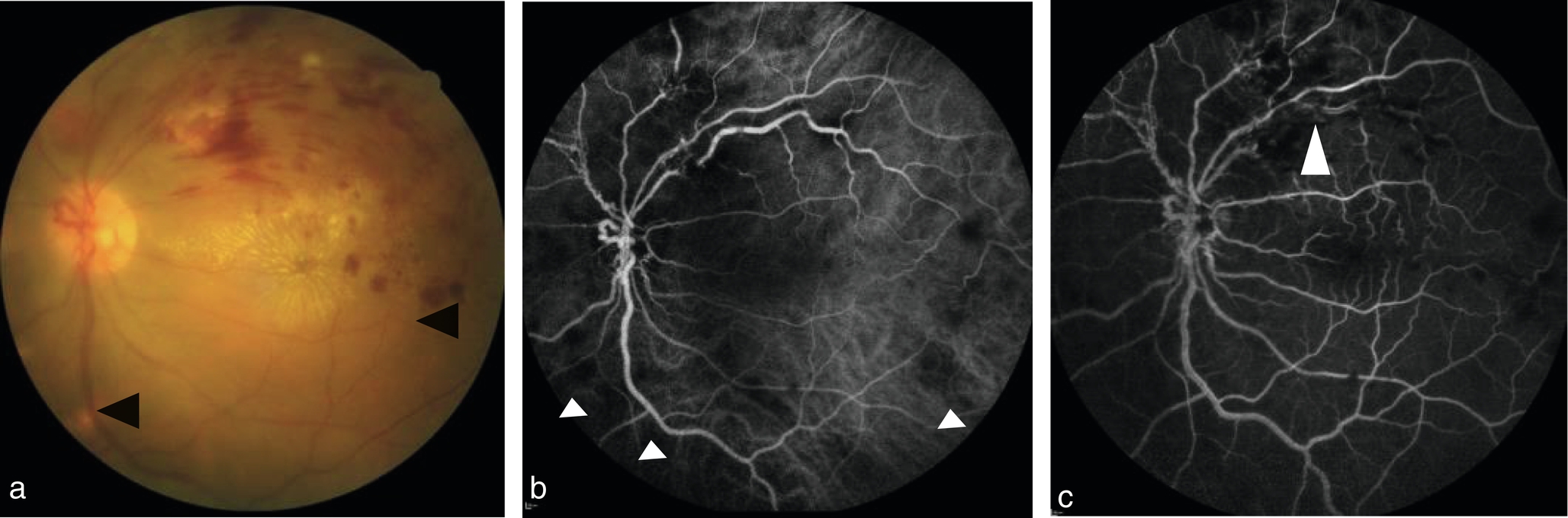 a. Rétinographie. Noter la présence de nodules choroïdiens (têtes de flèche) mieux visibles et plus nombreux à l'ICG (b, flèches). c. À l'angiographie à la fluorescéine, la veine occluse est mieux individualisée (tête de flèche) avec un ralentissement circulatoire. Noter le shunt optociliaire en regard de la papille.