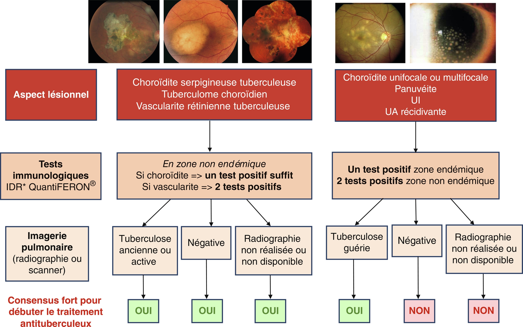*IO associée à une positivité d'un ou de deux tests immunologique (IDR/IGRA) et/ou à la présence d'anomalies radiologiques de tuberculose pulmonaire (séquellaire ou active) et/ou la présence de Mycobacterium tuberculosis détecté par PCR dans les tissus/liquides oculaires (paramètre non nécessaire). L'évolution se définit en trois stades [17].