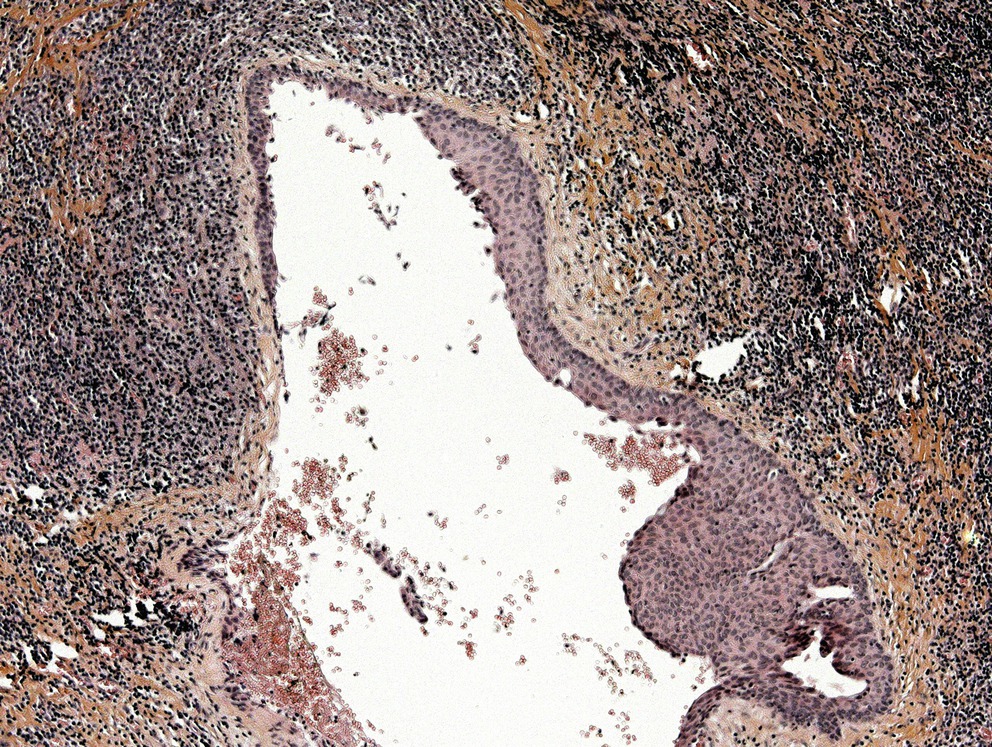Muqueuse lacrymale normale d'un canalicule dans sa portion horizontale (Orcéine, 10 ×).